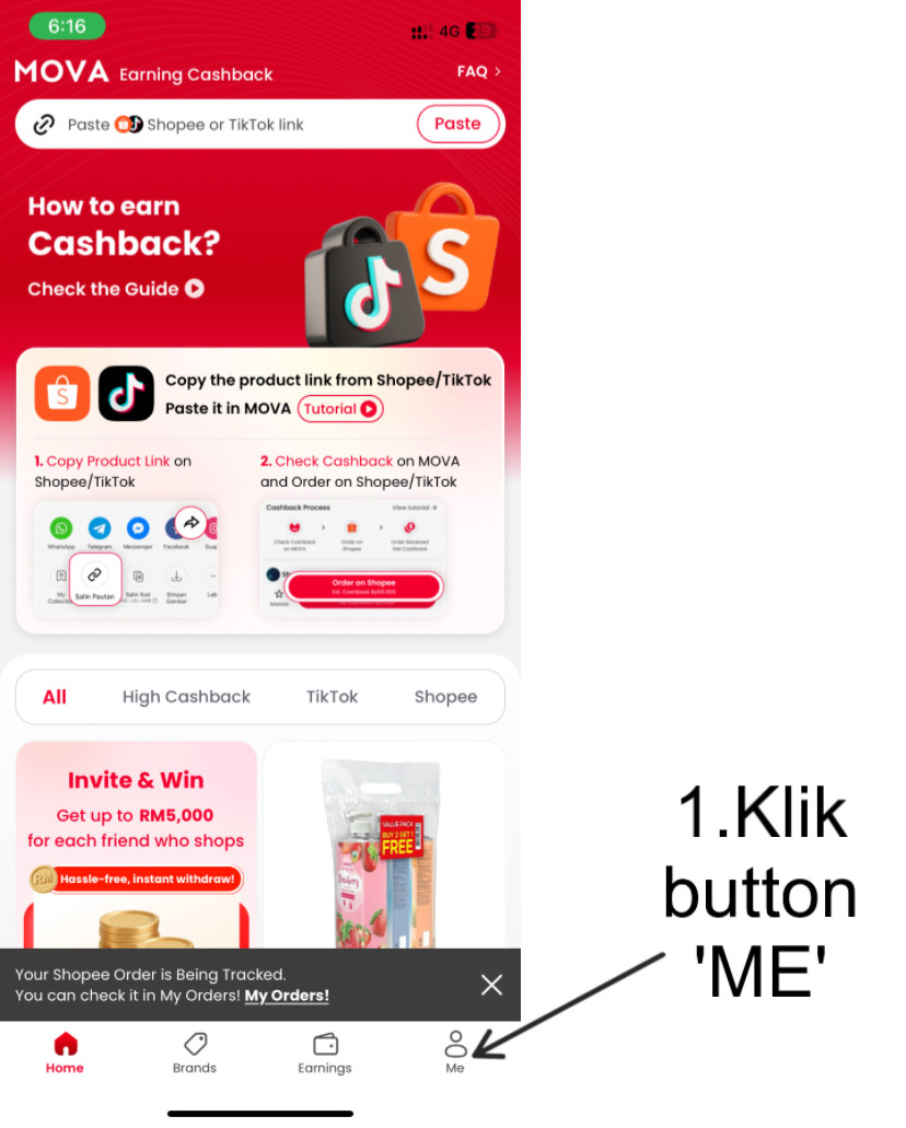 Selepas daftar, anda akan nampak profil akaun sendiri di bahagian "Me". Dari situ, anda boleh mula membuat pembelian, mengesan cashback, atau berkongsi link pendaftaran dengan orang lain. Semuanya direka untuk mudah difahami walaupun oleh pengguna kali pertama.